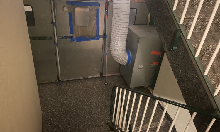 Eine Baustellensicherung war bei unserem Videodreh am 9. November 2025 nicht erkennbar. Keine Warnhinweise, keine Barrieren, keine Orientierung – nichts. Wer den Eingangsbereich passiert, steht plötzlich mitten in einer offenen Sanierungszone. Sogar Wohnungstüren von Eigentümern stehen unverschlossen im Raum.