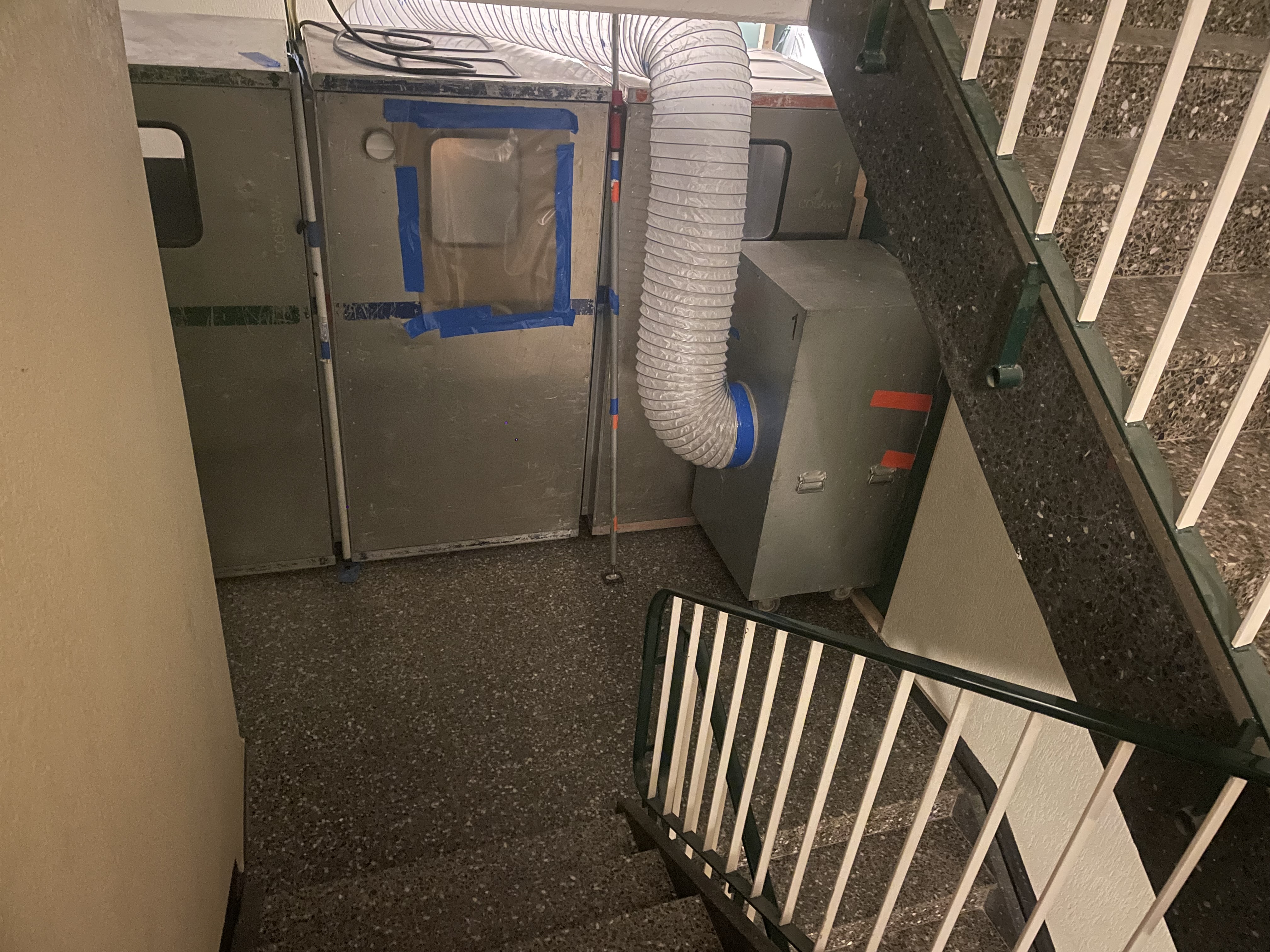 Bei unserem Besuch vor Ort fiel auf, dass neben den bekannten Mängeln nun mysteriöse „Dekontaminierungskabinen“ und Gebläseanlagen installiert wurden – angeblich zur Reinigung oder Belüftung von lungengängigen Faserstoffen, wie beispielsweise Asbest. Ob diese tatsächlich notwendig sind oder ob hier schlicht eine „Gelddruckmaschine“ erfunden wurde, bleibt fraglich.