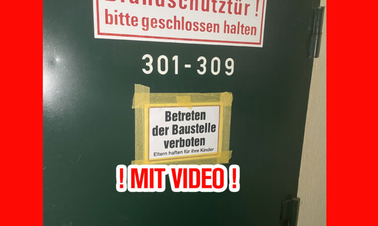 Noch immer sind Fluchtwege teilweise versperrt, oder verbarrikadiert. Baustellenschilder VOR den Fluchtwegen fordern die Bewohner und Gäste skurrilerweise auf, die Fluchtwege nicht zu benutzen. Das Betreten ist sogar ausdrücklich verboten, da es sich bei dem Fluchtflur um eine Baustelle handeln soll. Ein lebensgefährlicher Widerspruch, der im Ernstfall fatale Folgen haben könnte. Die Baustellen befinden sich nämlich in den Wohnungen, nicht jedoch in den Fluren!